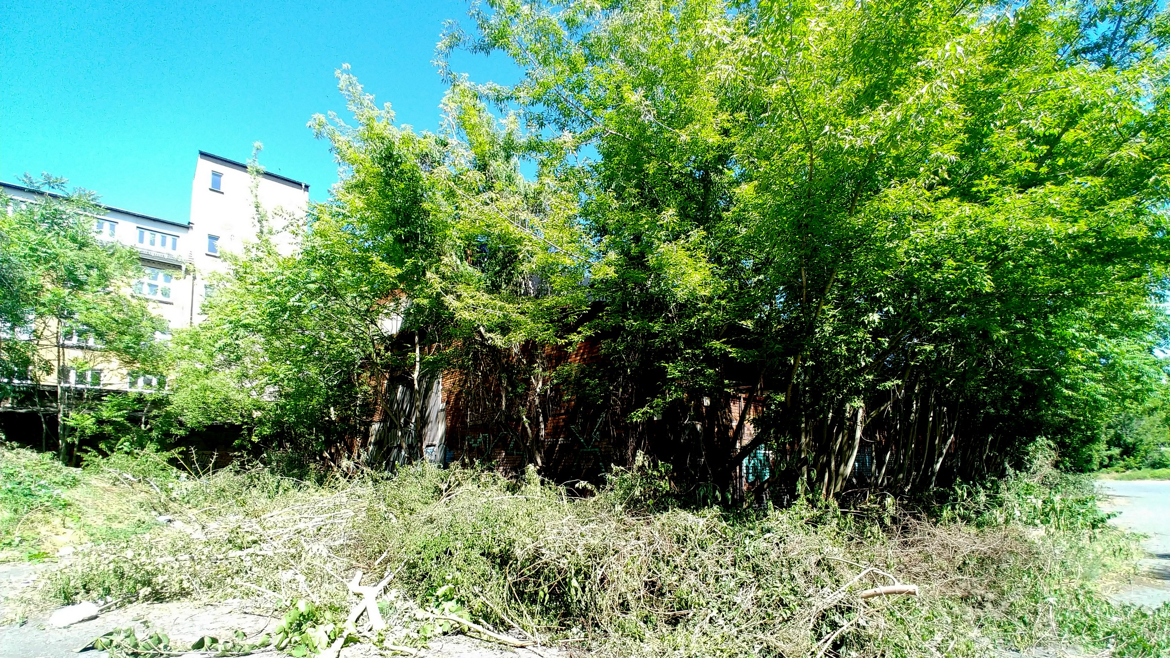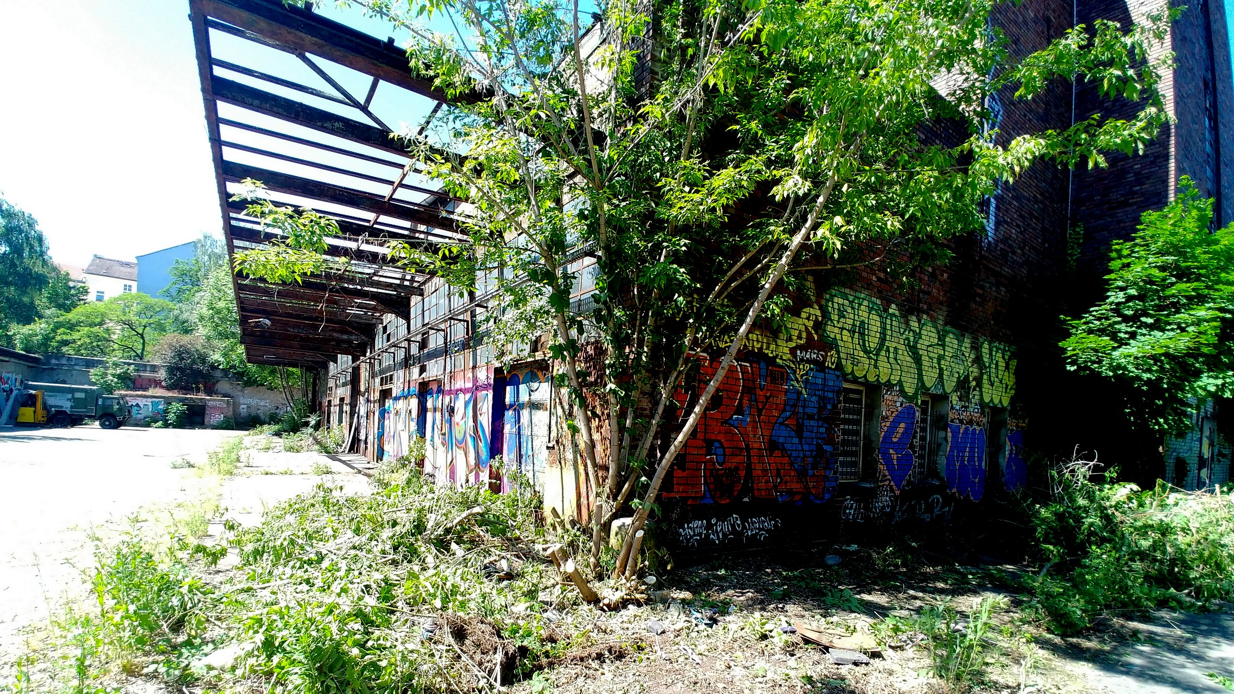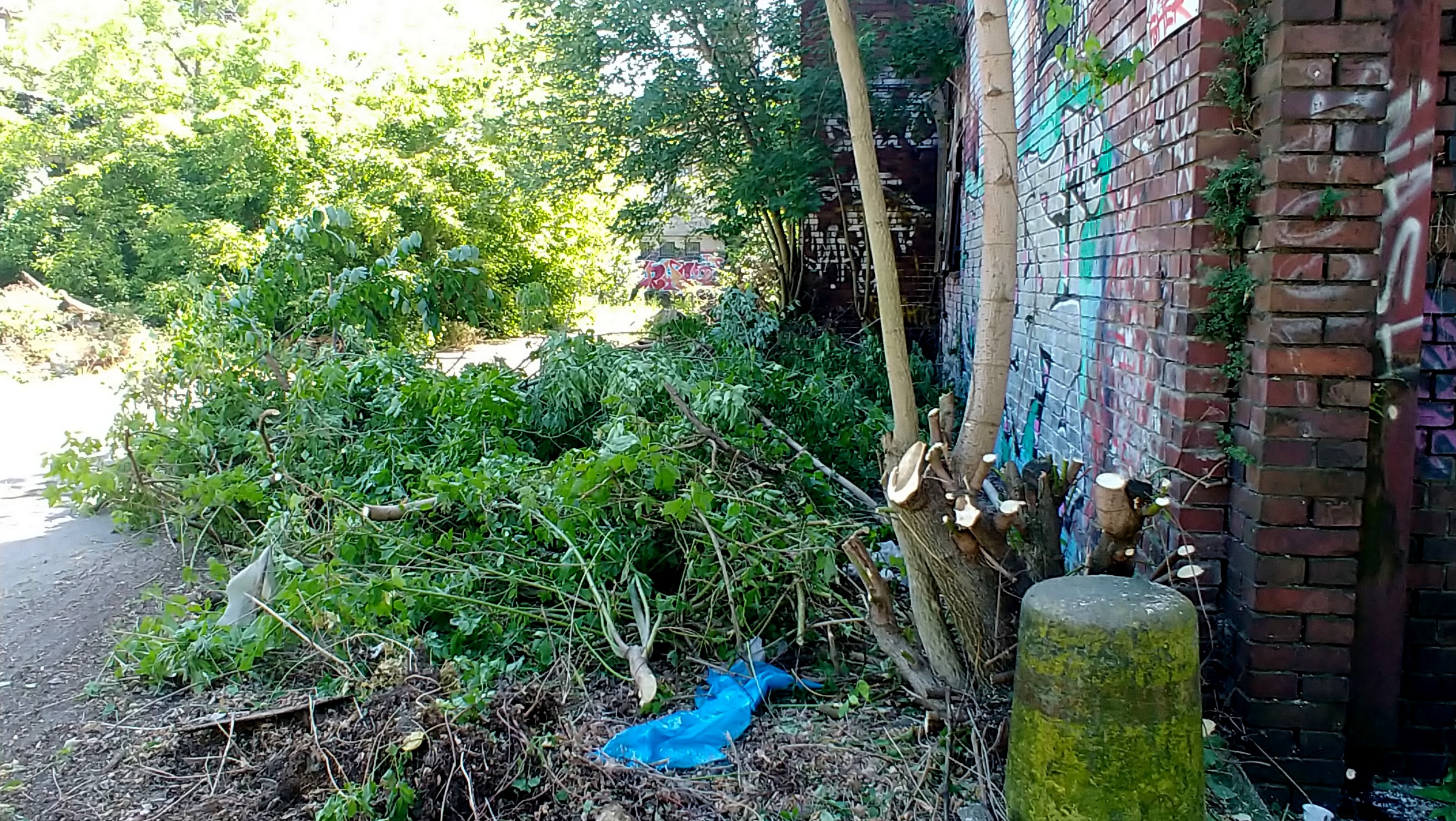 Der Grünbewuchs am riesigen Müllberg und in der einsturzgefährdeten ehemaligen Halle hinter der Köpi 137 mit ihren Gebüschgürteln ringsherum blieben unangetastet.