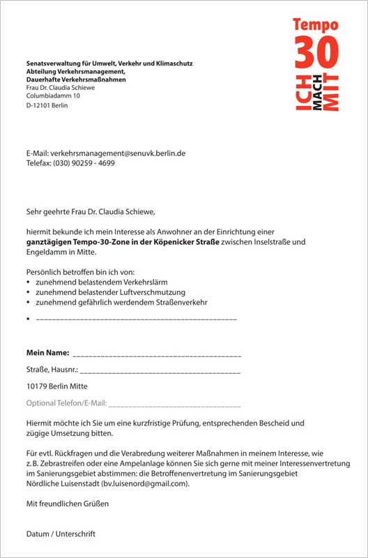 Bitte laden Sie den abgebildeten Brief herunter und schicken Sie diesen an die Senatsverwaltung. Tempo 30 in der Köpenicker Straße! Mach mit! weiterlesen
