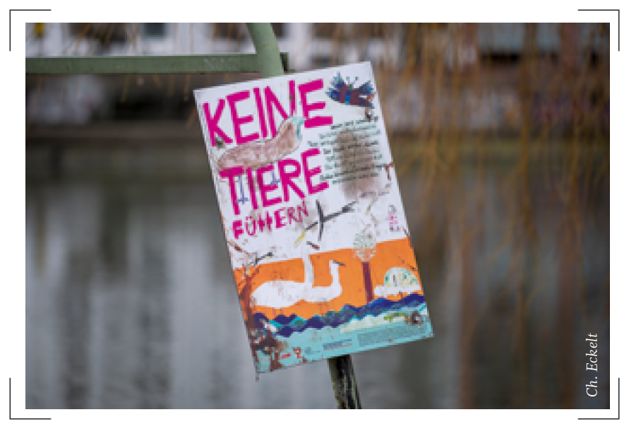 Bild oben: „Bitte nicht füttern“-Erklärschild – gefunden an der Wuhle in Köpenick, gestaltet von Grundschulkindern (Foto: Archiv BV)