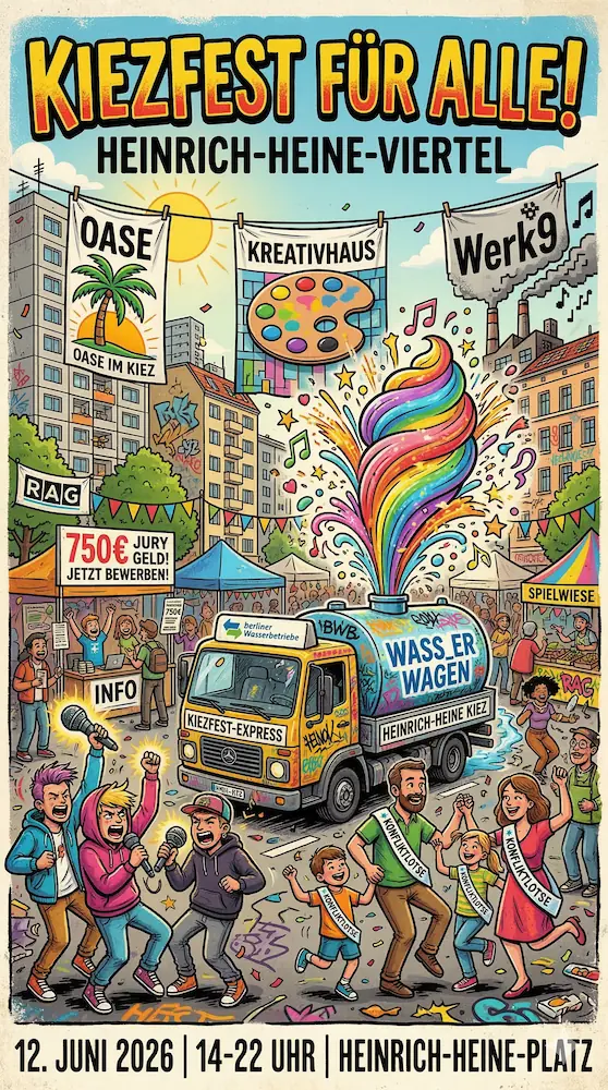 12. Juni 2026: Das große Kiezfest der RAG. Von 14:00 bis 19:00 Uhr gibt es ein volles Programm für Groß und Klein. Mit dabei sind Musik, Eisstände und sogar ein Wasserwagen der Berliner Wasserbetriebe zur Erfrischung. So ist jedenfalls der Plan.
