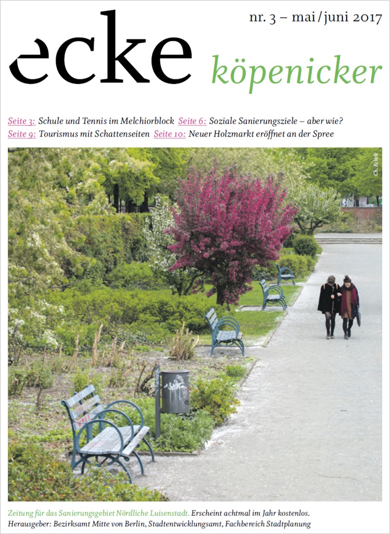 Sie lesen in dieser Ausgabe unter anderem folgende Themen: Schule und Tennos im Melchiorblock · Soziale Sanierungsziele – aber wie? · Tourismus mit Schattenseiten · Neuer Holzmarkt eröffnet an der Spree · u.a.m. …