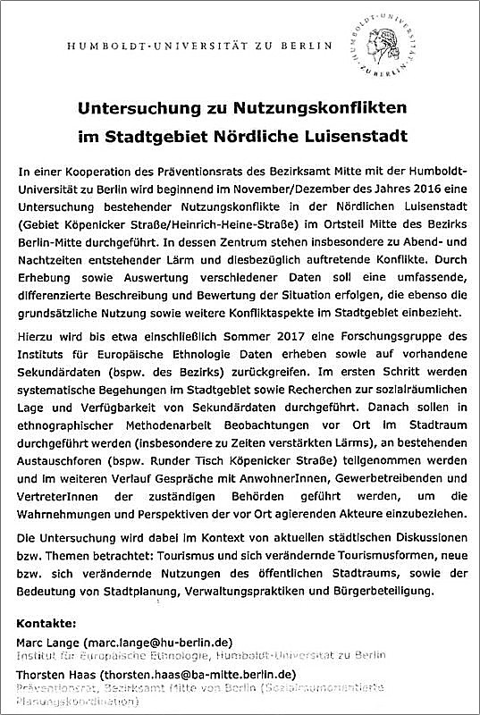 Die „Untersuchung zu Nutzungskonflikten im Stadtgebiet Nördliche Luisenstadt“ scheint noch nicht vom Tisch zu sein. Nach letzten Informationen vom „Runden Tisch“ soll die HU Untersuchung nun Anfang 2017 beginnen.