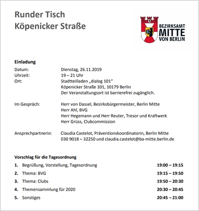 Präventionskoordinatorin Claudia Castelot sandte uns diese Einladung (siehe unten) zum nächsten „Runden Tisch Köpenicker Straße“: