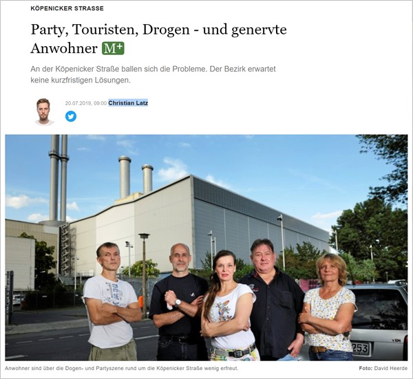 Unter dem Titel „Party, Touristen, Drogen – und genervte Anwohner“ und der Unterzeile „An der Köpenicker Straße ballen sich die Probleme. Der Bezirk erwartet keine kurzfristigen Lösungen“ lässt Reporter Christian Latz Anwohner zu Wort kommen und schildert ausführlich die bekannten Probleme.