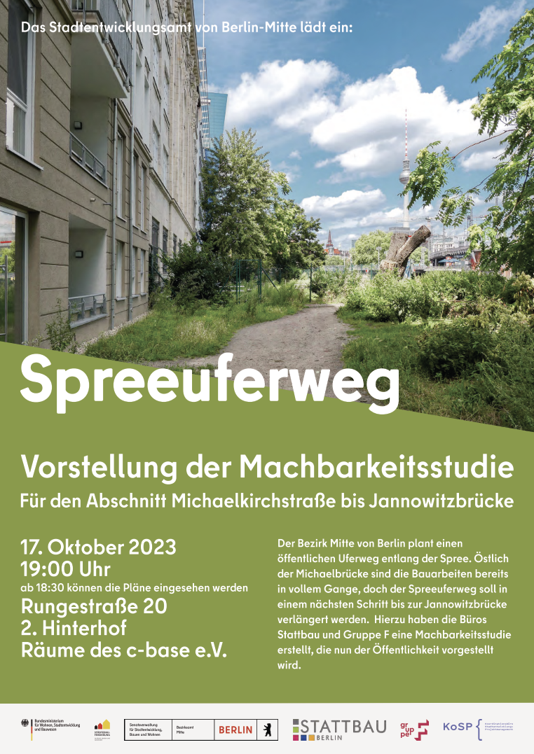 Einladung. Öffentliche Informationsveranstaltung des Stadtentwicklungsamtes von Mitte, Durchführung Gebietsbetreuer KoSP. Vorstellung der Machbarkeitsstudie zum „Spreeuferweg Abschnitt Rungestraße“. Um 19 Uhr in der Mainhall der c-base.