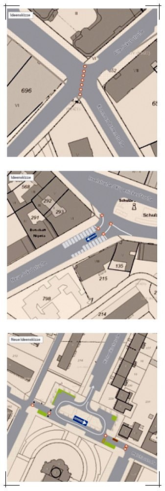 Diagonal über die Kreuzung verläuft dabei eine Reihe aus Pollern, die von Radfahrenden problemlos passiert werden kann. Der motorisierte Verkehr muss aber abbiegen, die beiden Straßen sind für ihn nicht mehr durchgehend zu passieren, der Durchgangsverkehr wird damit unterbunden.