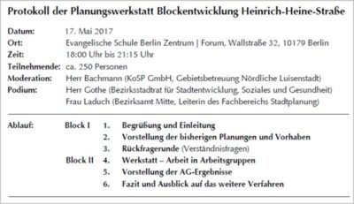 Nach drei Monaten ist nun das unter den Beteiligten und Veranstaltern (Bezirksamt, Bezirksbaustadtrat, KOsP Gebietsbetreuer) abgestimmte Protokoll der offenen Planungswerkstatt zu der anstehenden Verdichtung entlang der Heinrich-Heine-Straße und der Köpenicker Straße freigegeben.