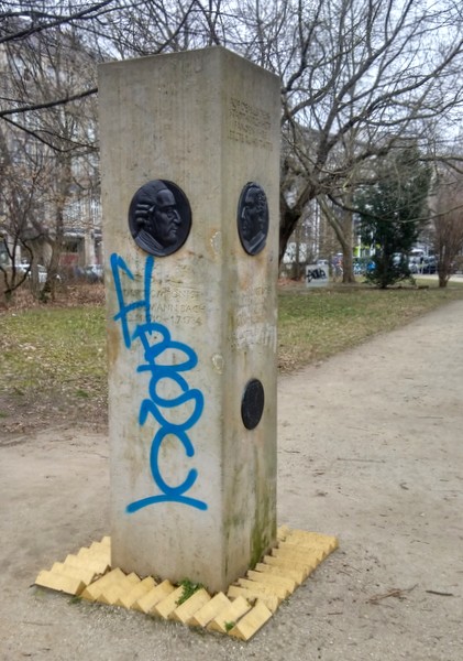 Der Bürgerverein Luisenstadt, der mit der Initiative von Dr. Klaus Duntze in Zusammenarbeit mit dem Denkmalamt diese Stele hat aufstellen lassen, bittet um Hinweise zu diesem respektlosen Vandalismus.