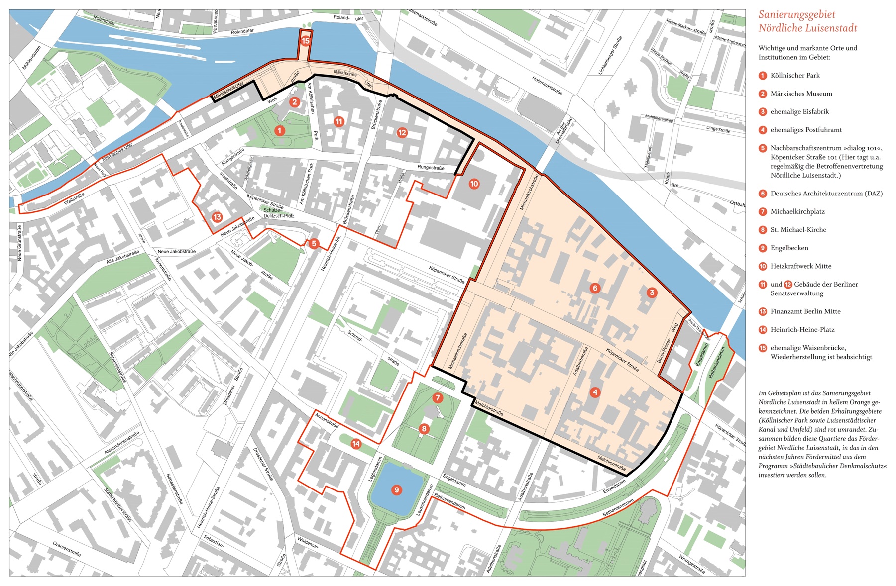 Bild oben: Ausschnitt westliches Erhaltungsgebiet des Fördergebietes Nördliche Luisenstadt. 5: Nachbarschaftszentrum dialog 101 mit Vorplatz. (13: Finanzamt Mitte).