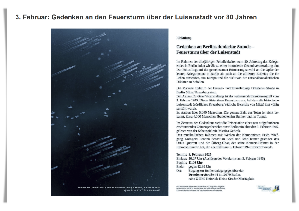 Vor genau 80 Jahren, am 3. Februar 1944, erlebte Berlin den schwersten Bombenangriff im Zweiten Weltkrieg. 958 Flugzeuge der US-Airforce überflogen die Stadt – ihr Ziel war das Zeitungs- und Regierungsviertel. Überall brannte es, Tausende wurden unter den Trümmern ihrer Häuser begraben und starben. Und da war die zentral gelegene Luisenstadt auch schwer betroffen.